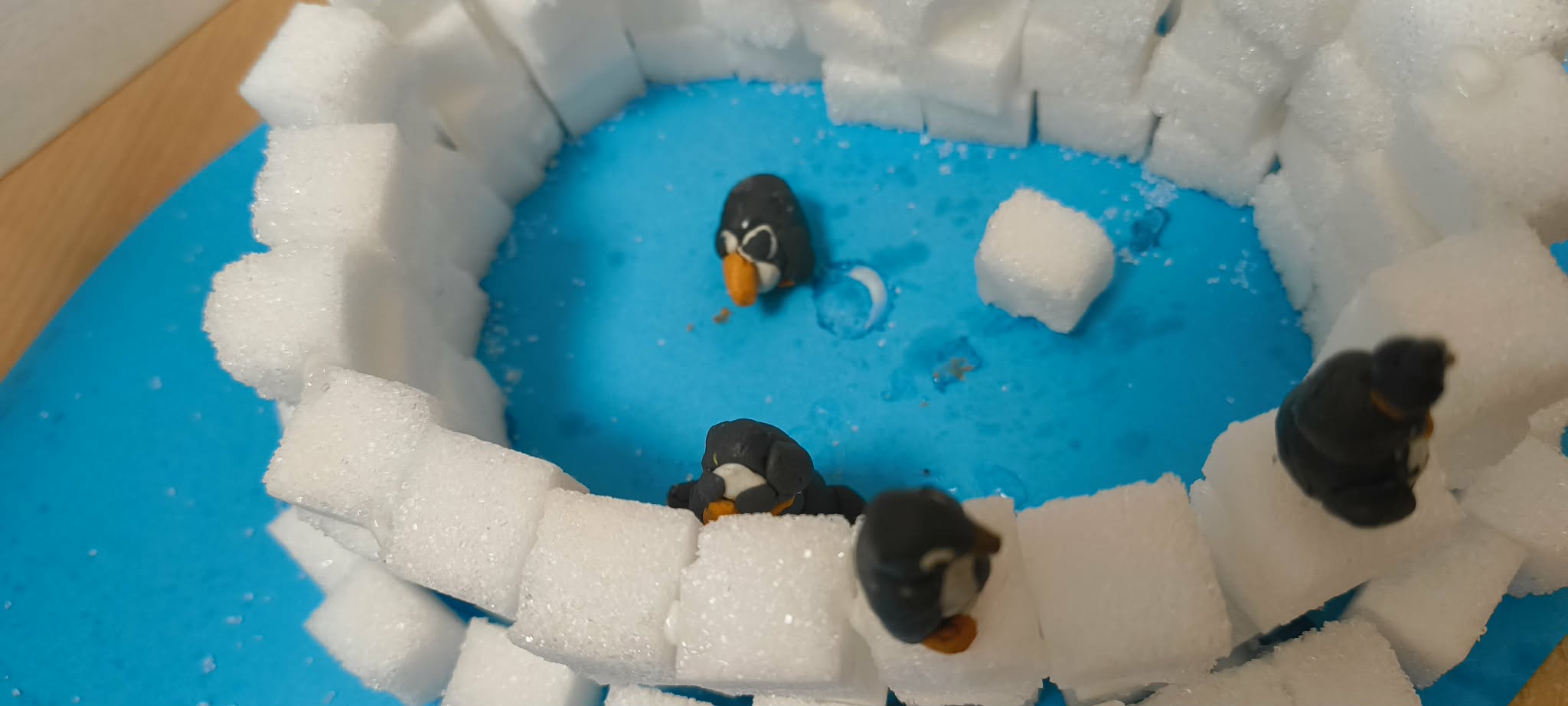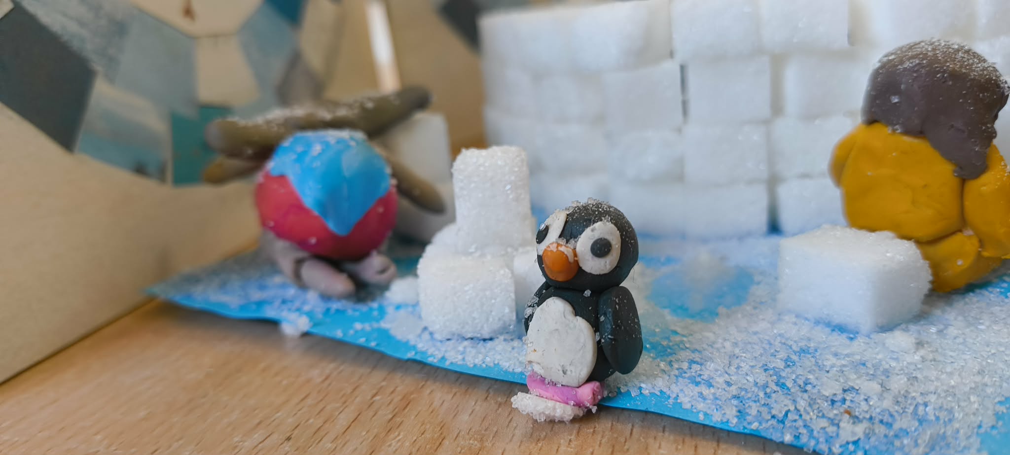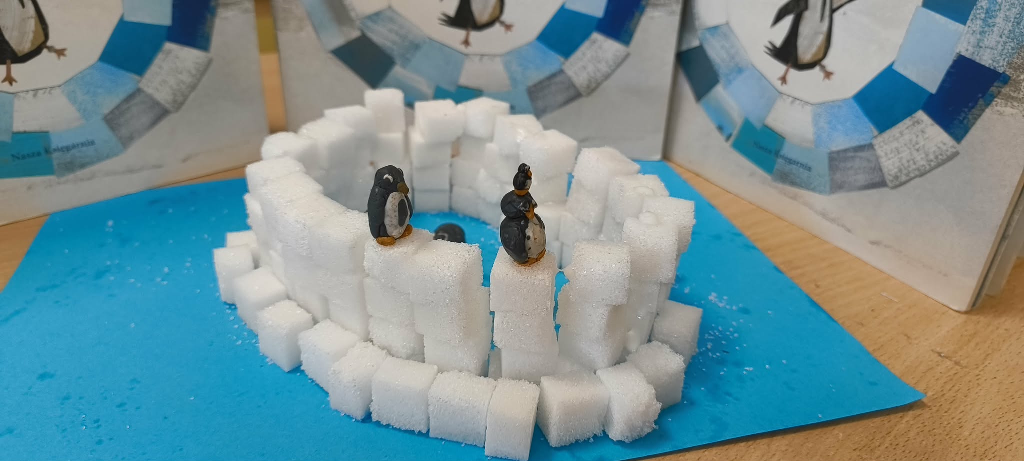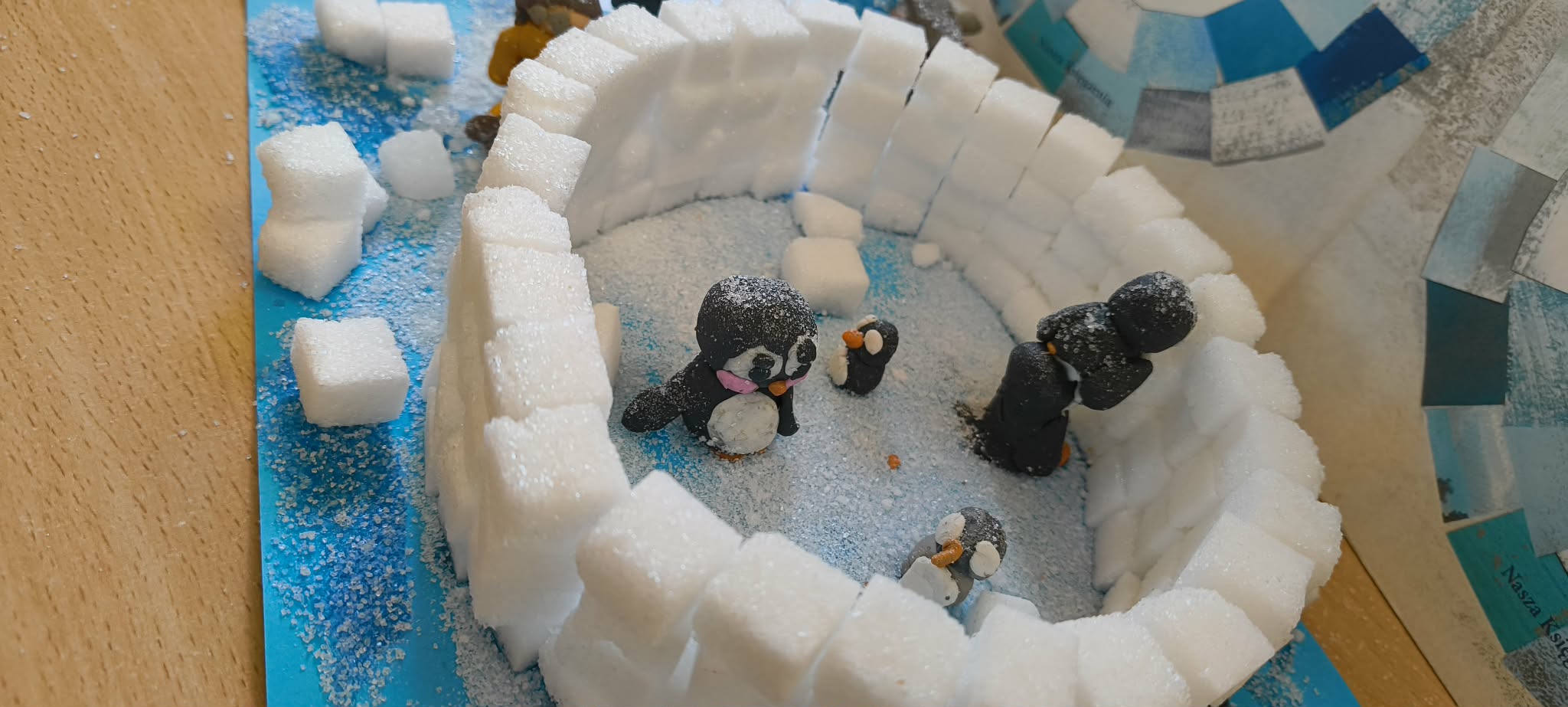 Przy okazji omawiania „Zaczarowanej zagrody” Aliny i Czesława Centkiewiczów uczniowie w grupach „wyczarowali” z kostek cukru i plasteliny zagrody dla pingwinów. Dostrzeżemy w nich polską stację badawczą, śmigłowiec, lamparta morskiego, Elegancika z krawatem i dużo innych