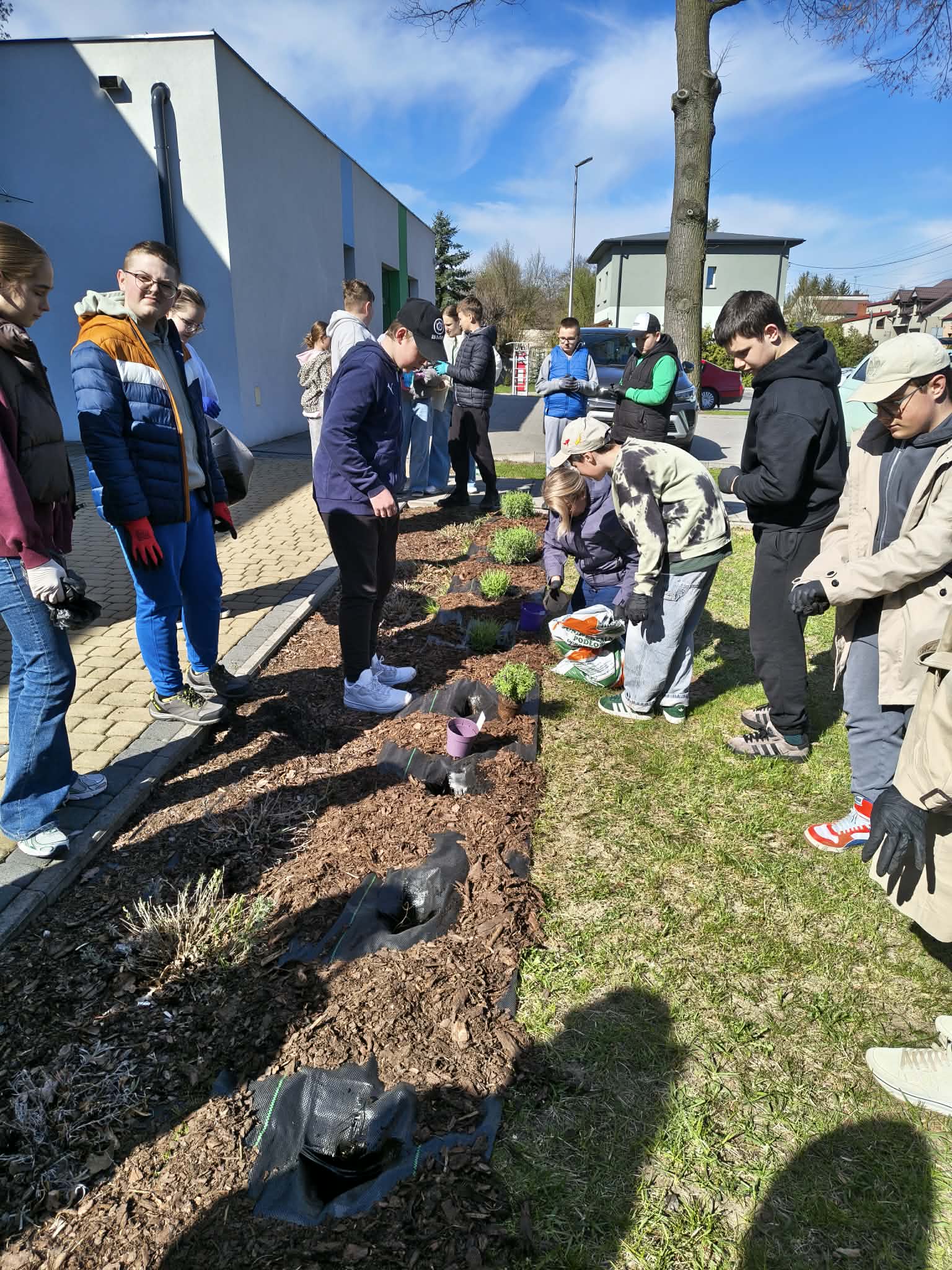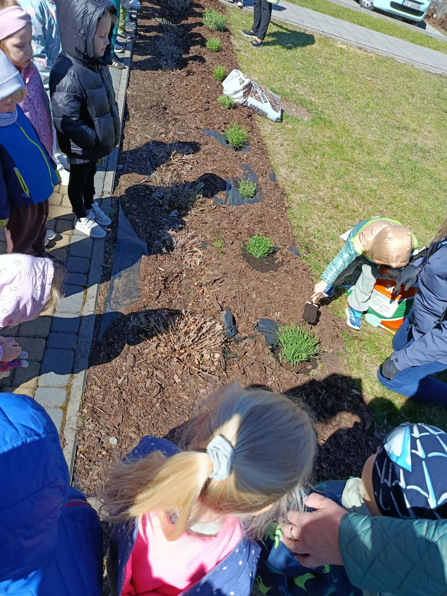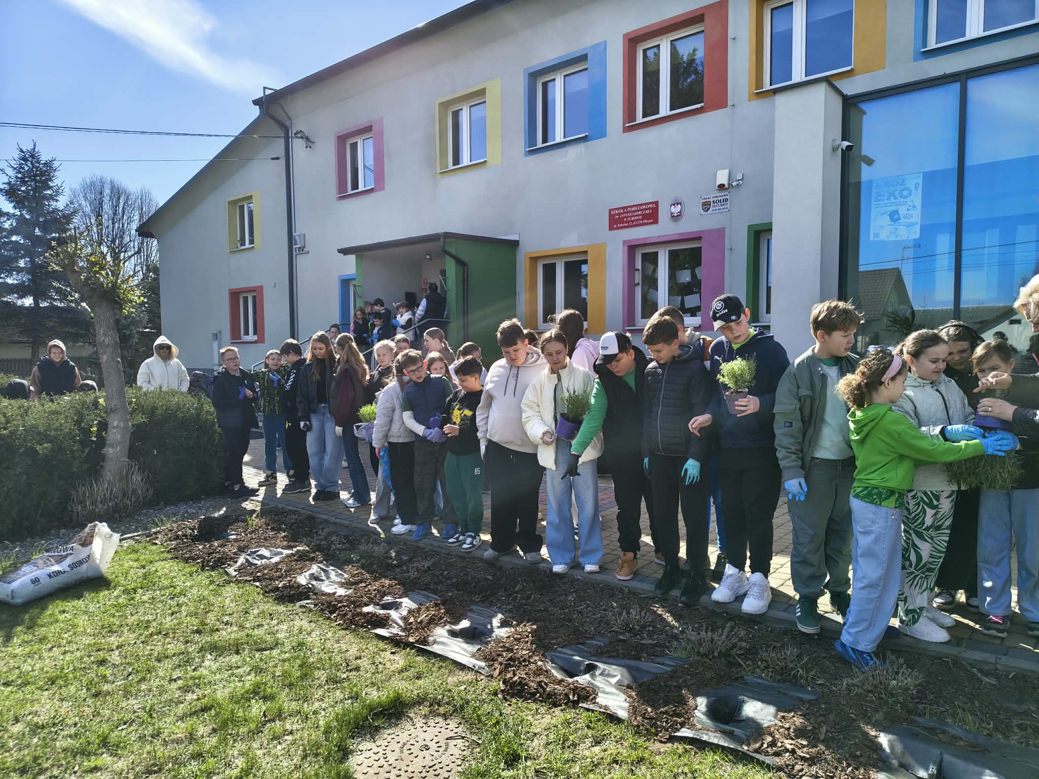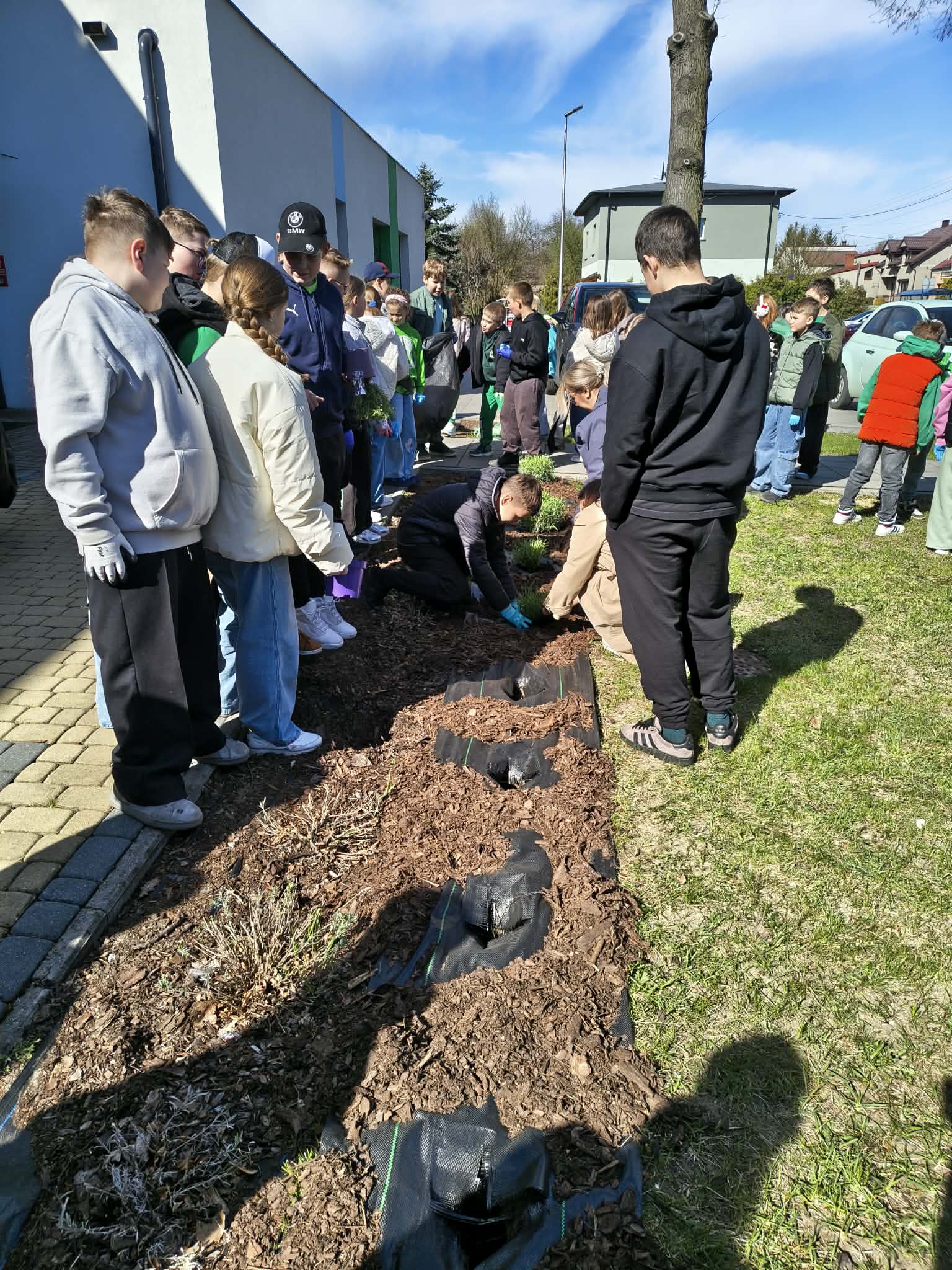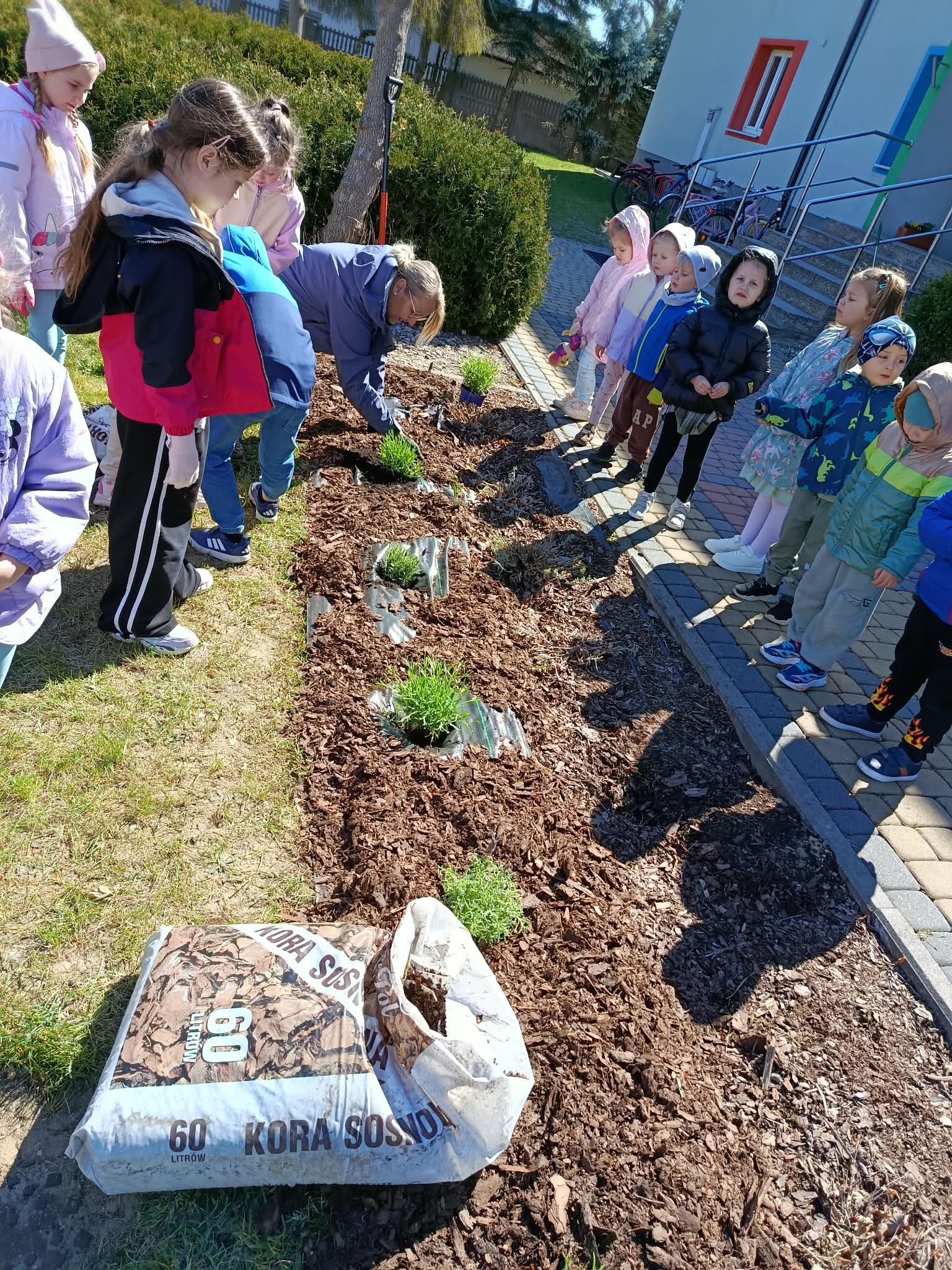 Uczniowie i dzieci z oddziałów przedszkolnych z zaangażowaniem posadzili lawendę